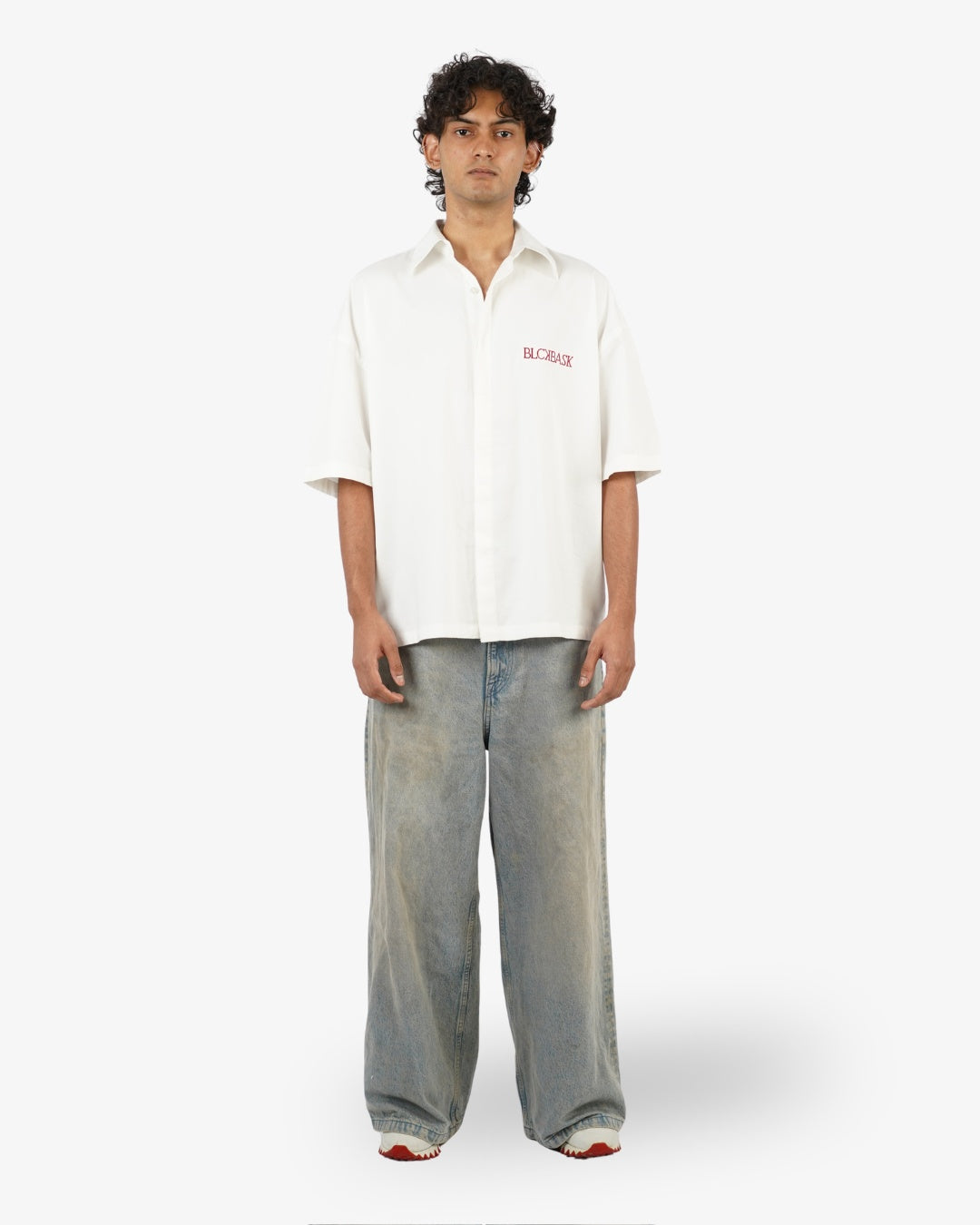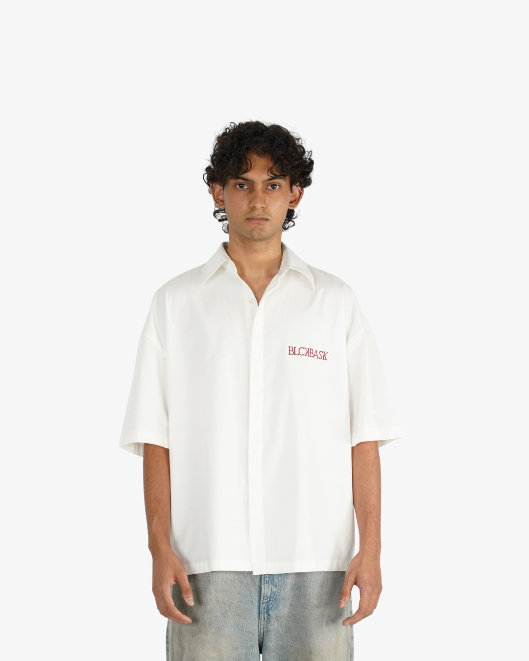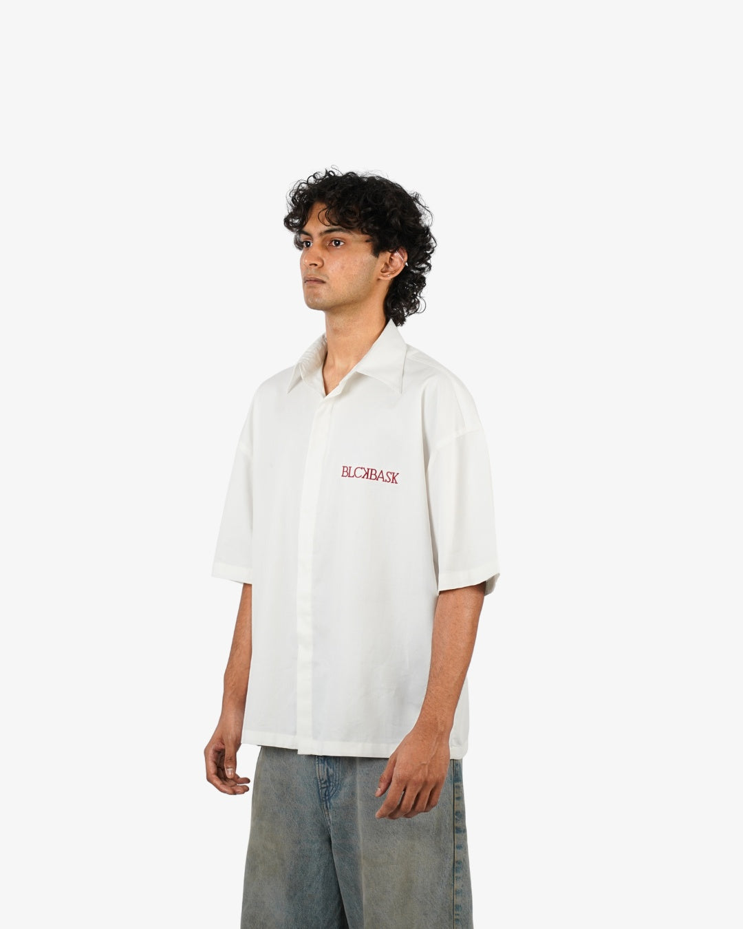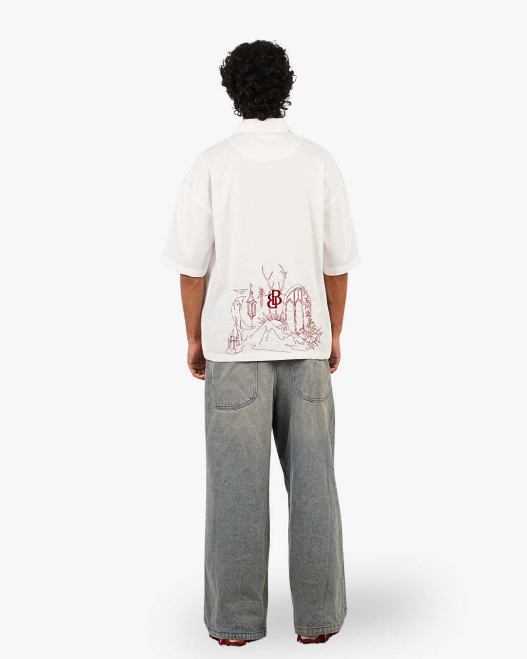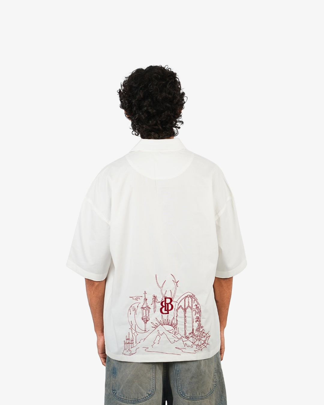 This white short-sleeve shirt features a slightly oversized fit, offering a relaxed and modern silhouette. Crafted from soft, breathable Cotton Twill fabric, it’s detailed with bold red embroidery on the front showcasing signature branding. On the back, it’s delicately embroidered in the same red thread, adding a meaningful and unexpected element that speaks to simplicity and connection with the natural world.